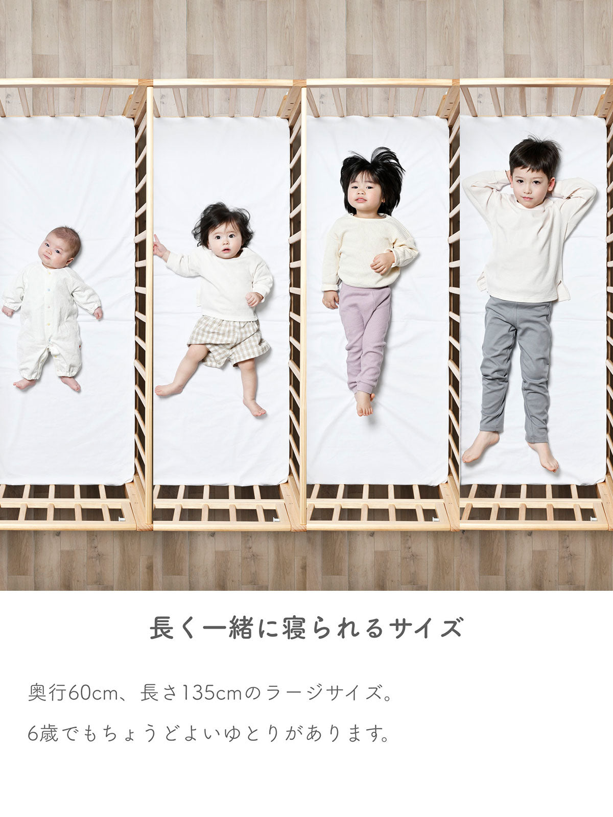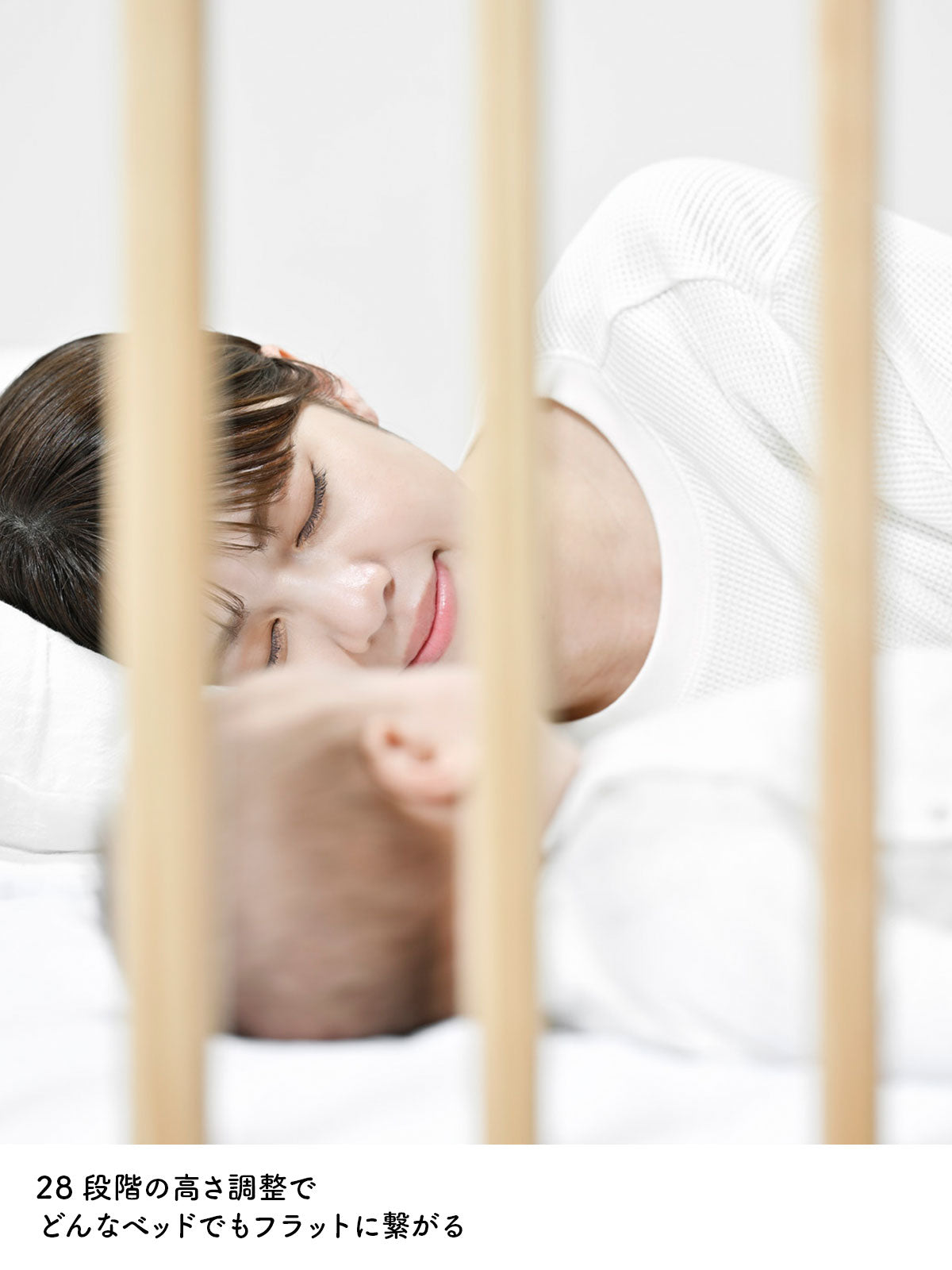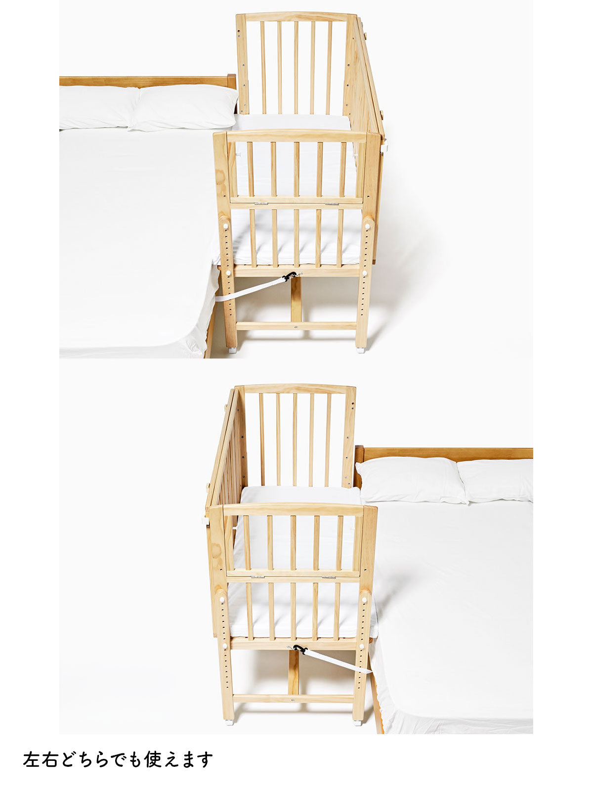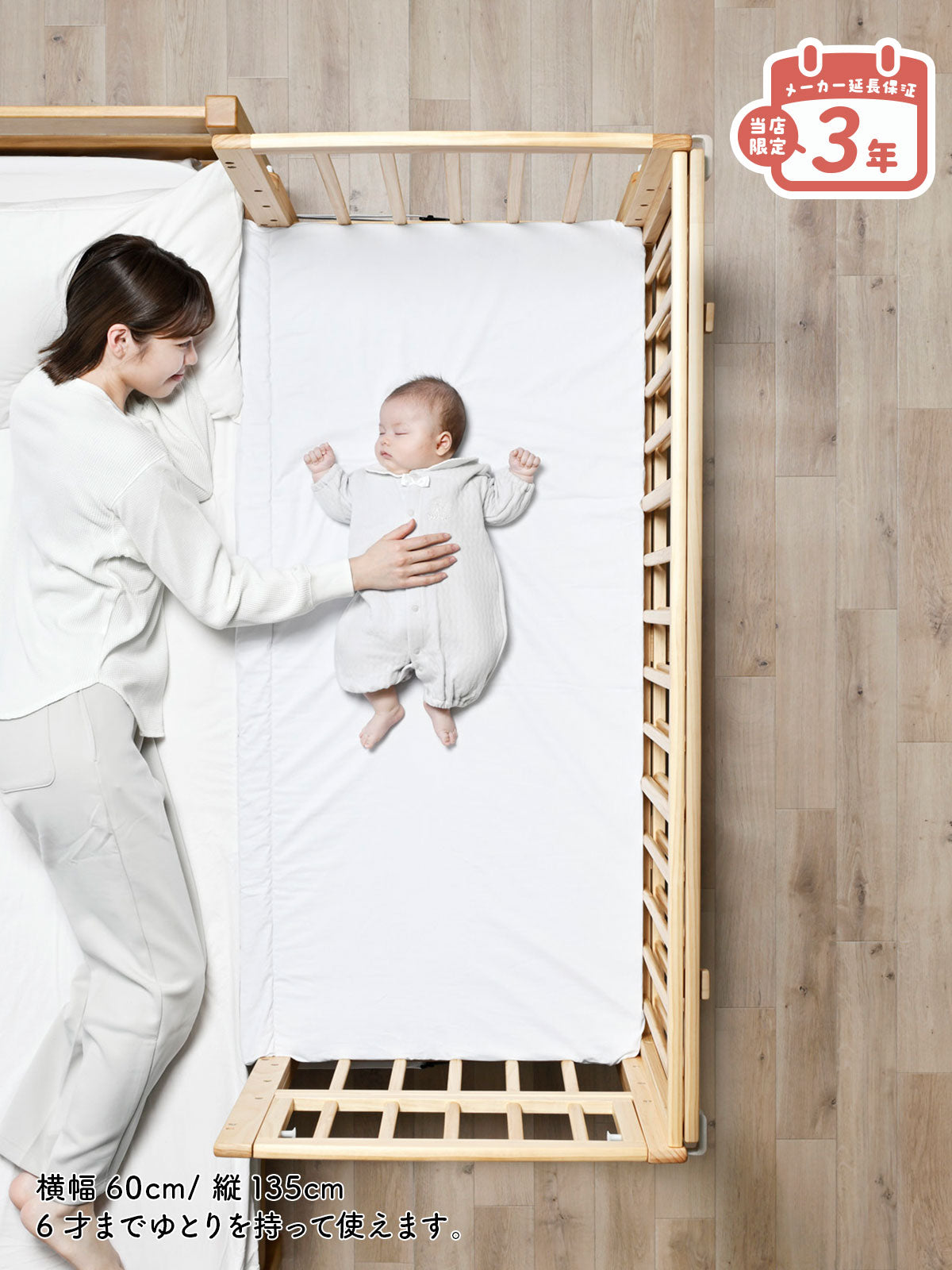 一つのベッドで一緒に寝るよりも気楽で、別々で寝るよりも安心。親子が一緒に寝られるわずかな期間をより素敵な時間にして欲しい。お子様は、ママのにおい、寝息を感じて安心して眠る。ママは、お子様の寝顔を見ながら癒される。そんな添い寝ができるベビーベッド。大人のベッドの高さと合わせ、段差なくつなげて使用可能。6歳頃まで使用可能。専用マットレス付き。本体はナチュラルとホワイトの2色展開。
