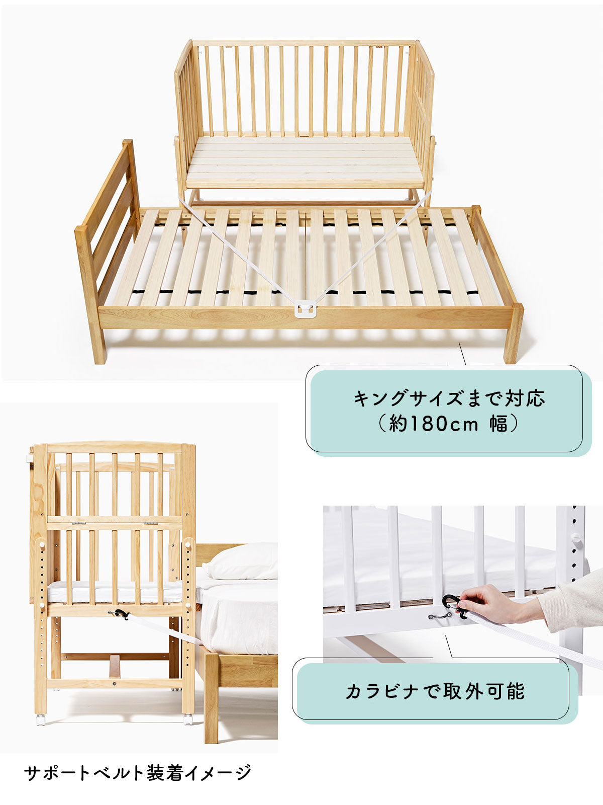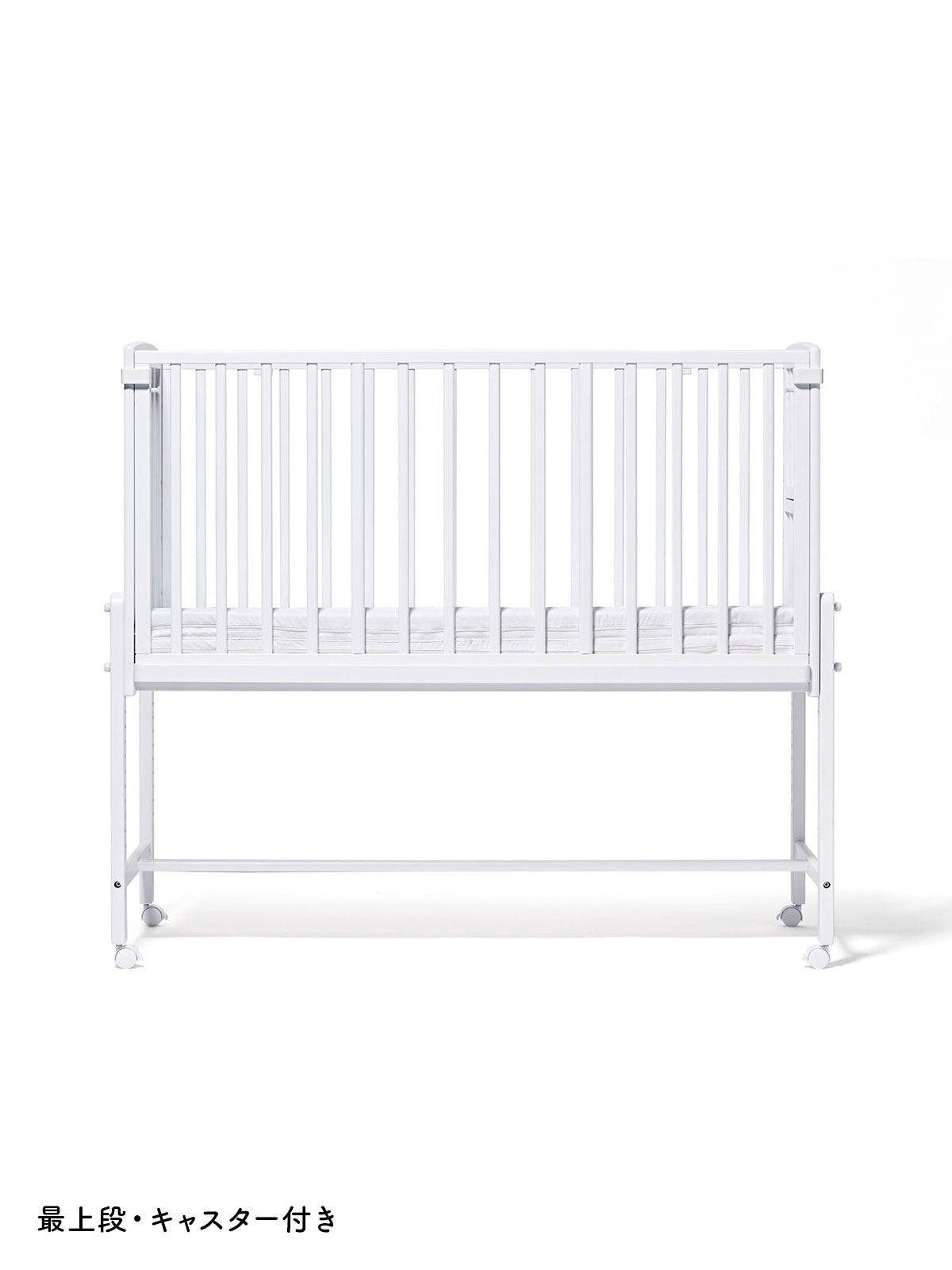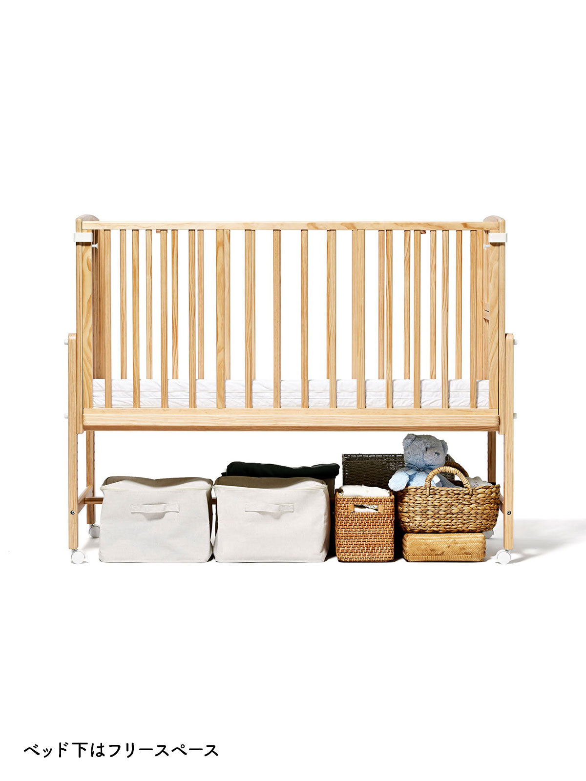 一つのベッドで一緒に寝るよりも気楽で、別々で寝るよりも安心。親子が一緒に寝られるわずかな期間をより素敵な時間にして欲しい。お子様は、ママのにおい、寝息を感じて安心して眠る。ママは、お子様の寝顔を見ながら癒される。そんな添い寝ができるベビーベッド。大人のベッドの高さと合わせ、段差なくつなげて使用可能。6歳頃まで使用可能。専用マットレス付き。本体はナチュラルとホワイトの2色展開。