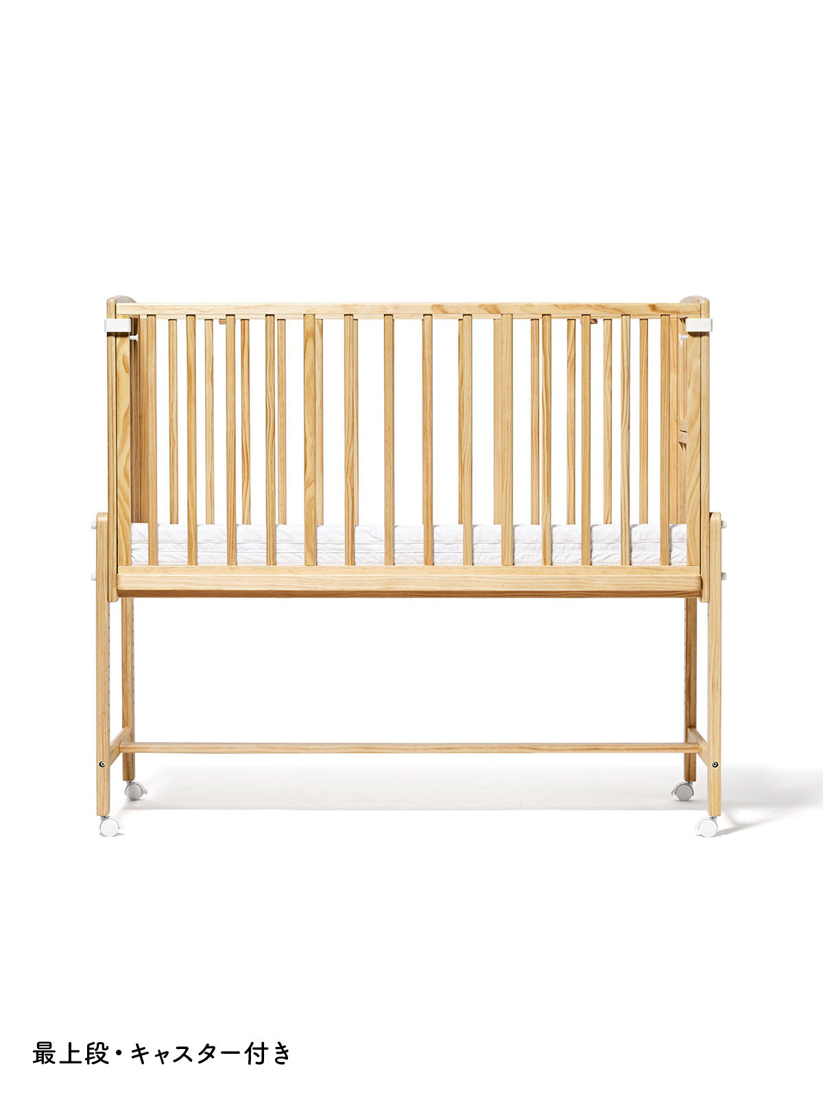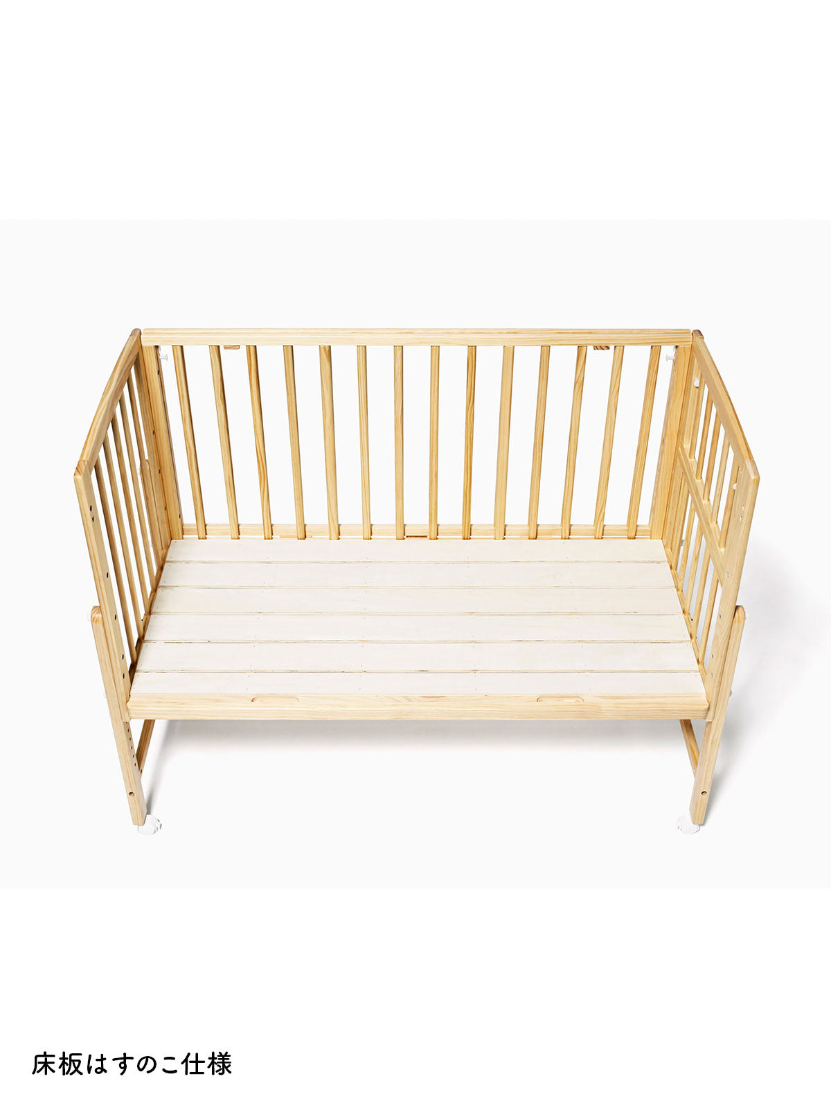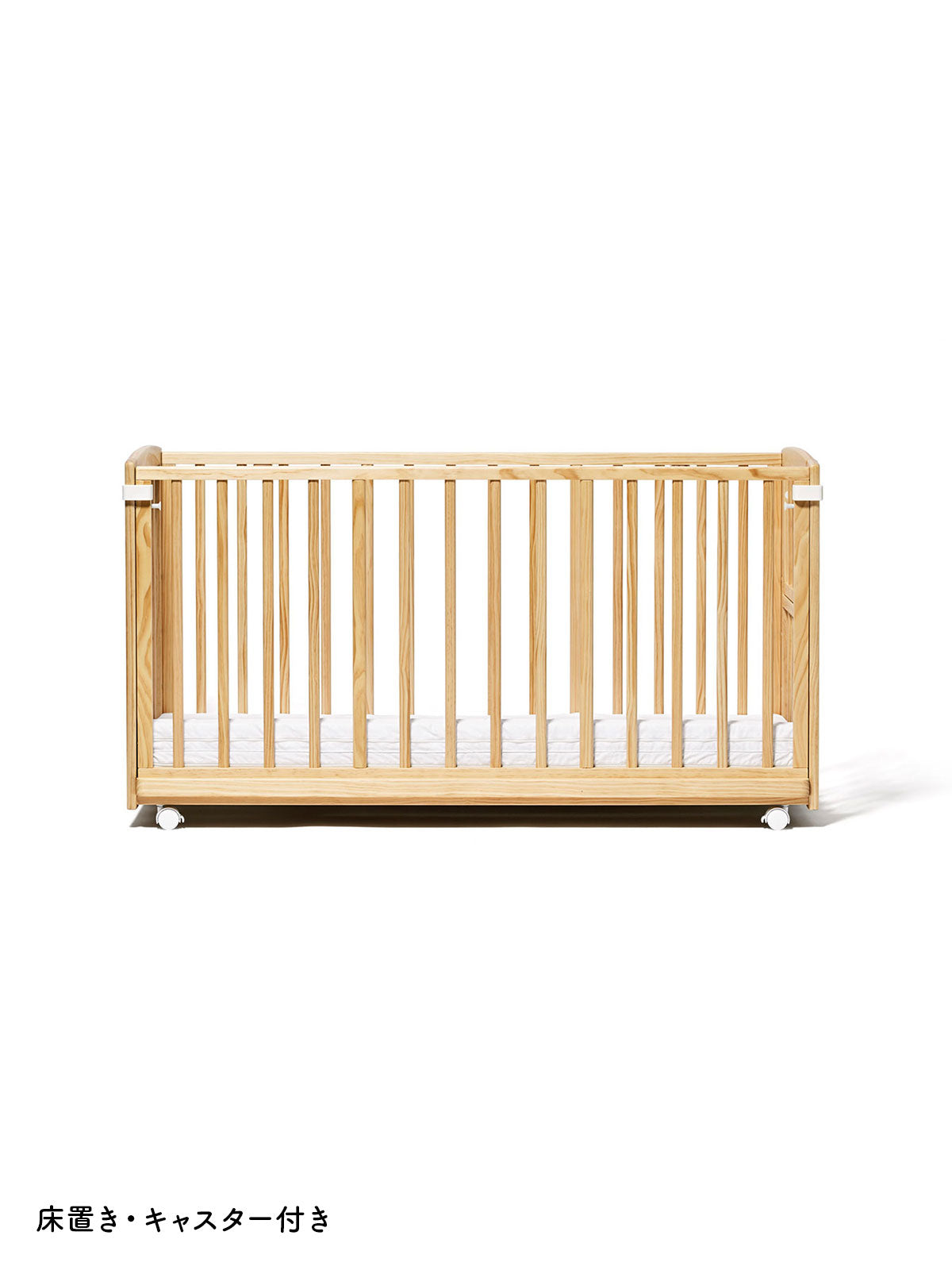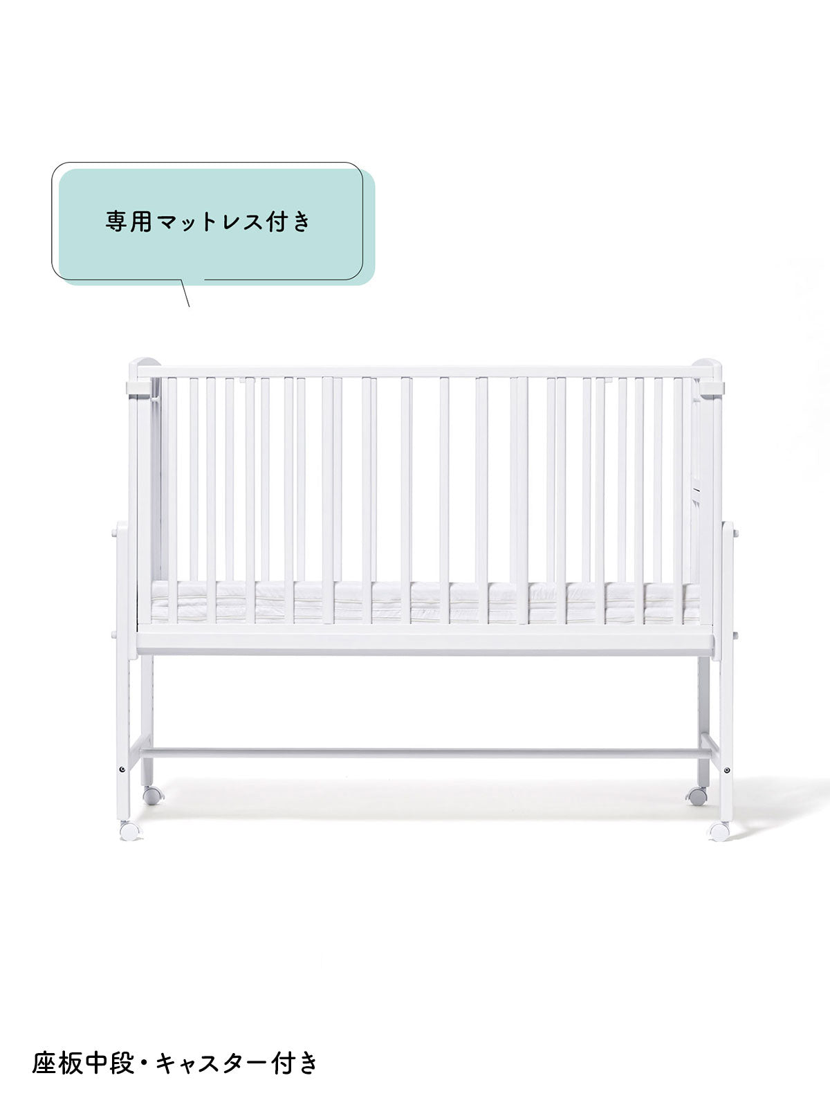 一つのベッドで一緒に寝るよりも気楽で、別々で寝るよりも安心。親子が一緒に寝られるわずかな期間をより素敵な時間にして欲しい。お子様は、ママのにおい、寝息を感じて安心して眠る。ママは、お子様の寝顔を見ながら癒される。そんな添い寝ができるベビーベッド。大人のベッドの高さと合わせ、段差なくつなげて使用可能。6歳頃まで使用可能。専用マットレス付き。本体はナチュラルとホワイトの2色展開。