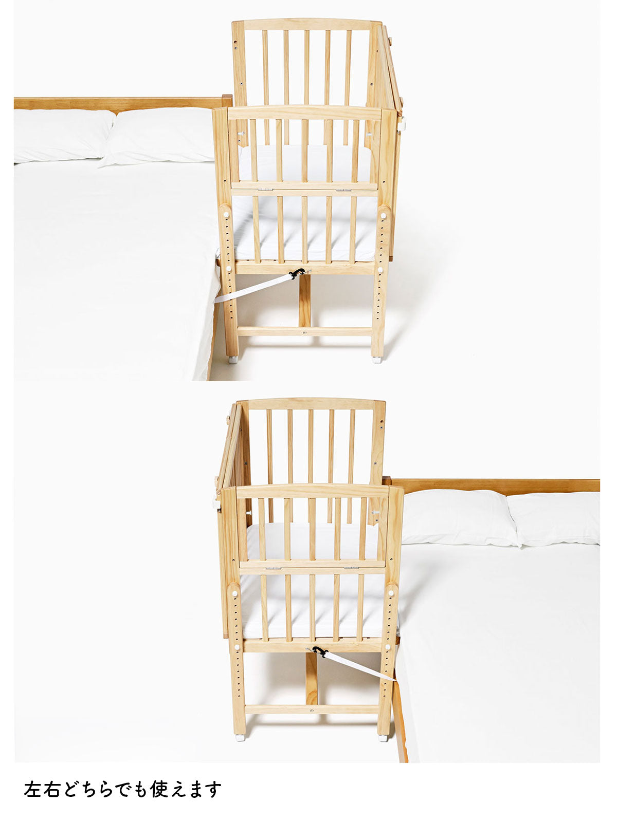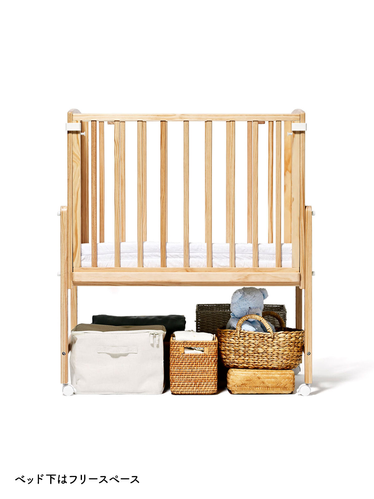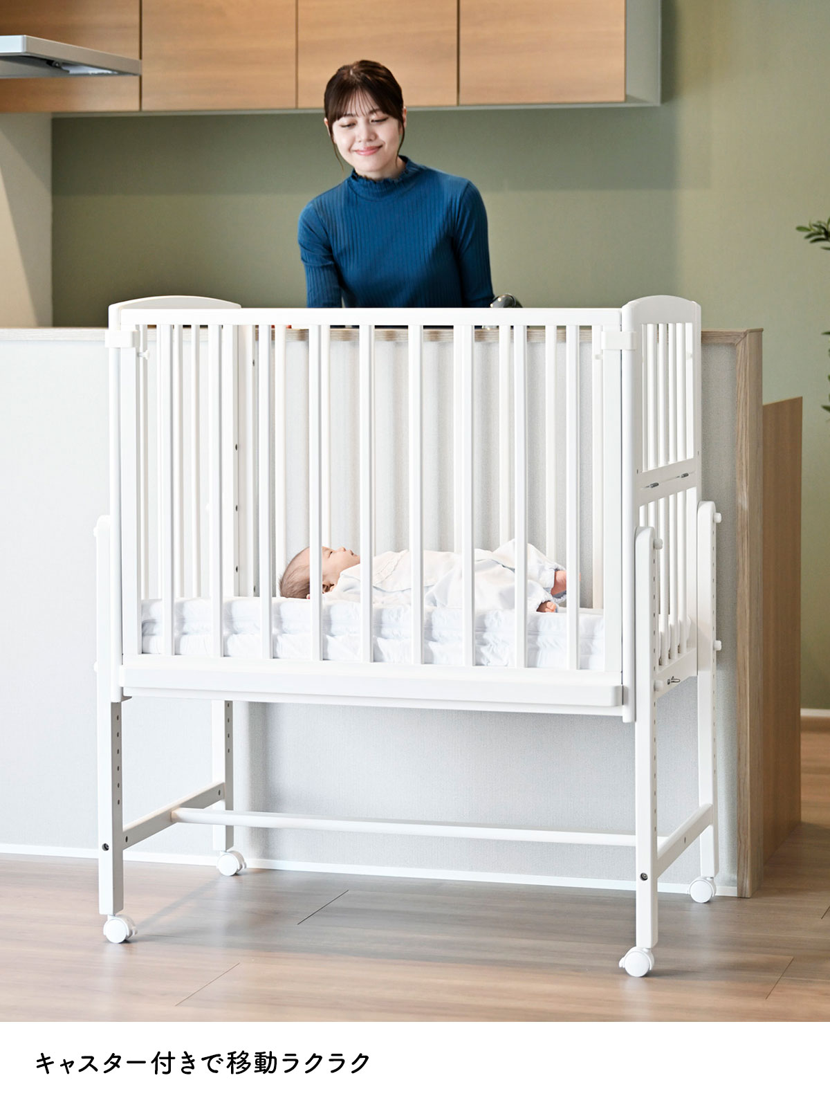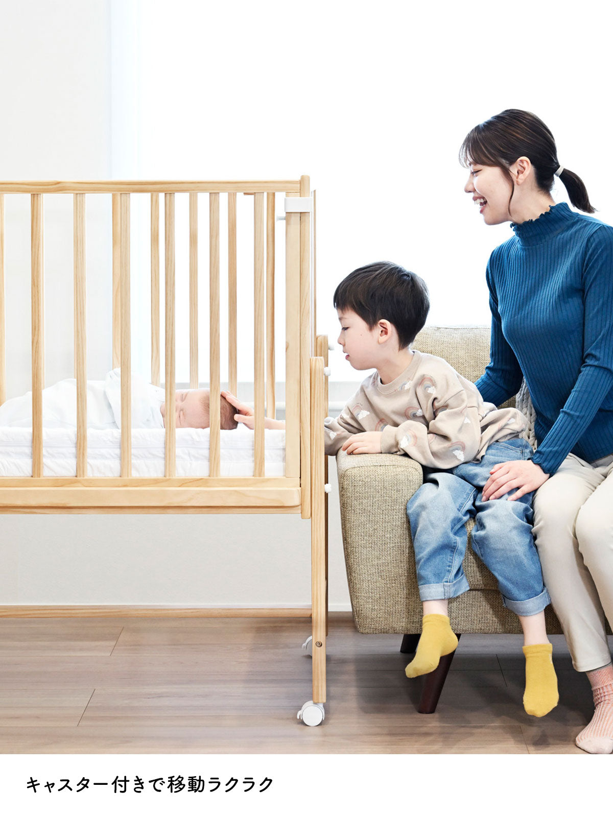 一つのベッドで一緒に寝るよりも気楽で、別々で寝るよりも安心。親子が一緒に寝られるわずかな期間をより素敵な時間にして欲しい。お子様は、ママのにおい、寝息を感じて安心して眠る。ママは、お子様の寝顔を見ながら癒される。そんな添い寝ができるベビーベッド。大人のベッドの高さと合わせ、段差なくつなげて使用可能。キャスター付きでお部屋間の移動もラクラクです。サイドマットレス付シーツ付き。本体はナチュラルとホワイトの2色展開。