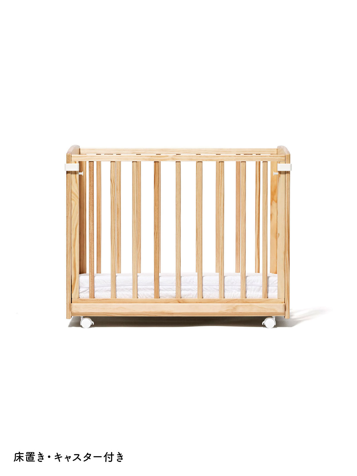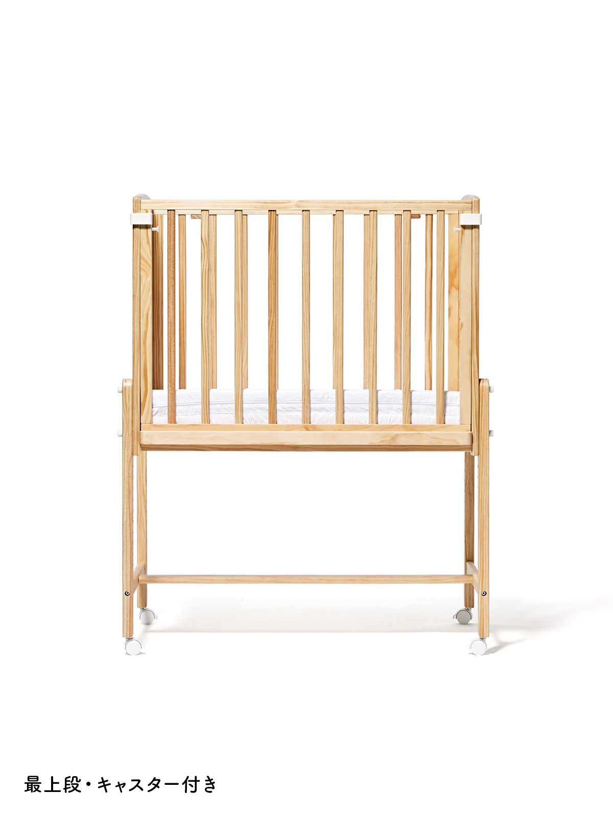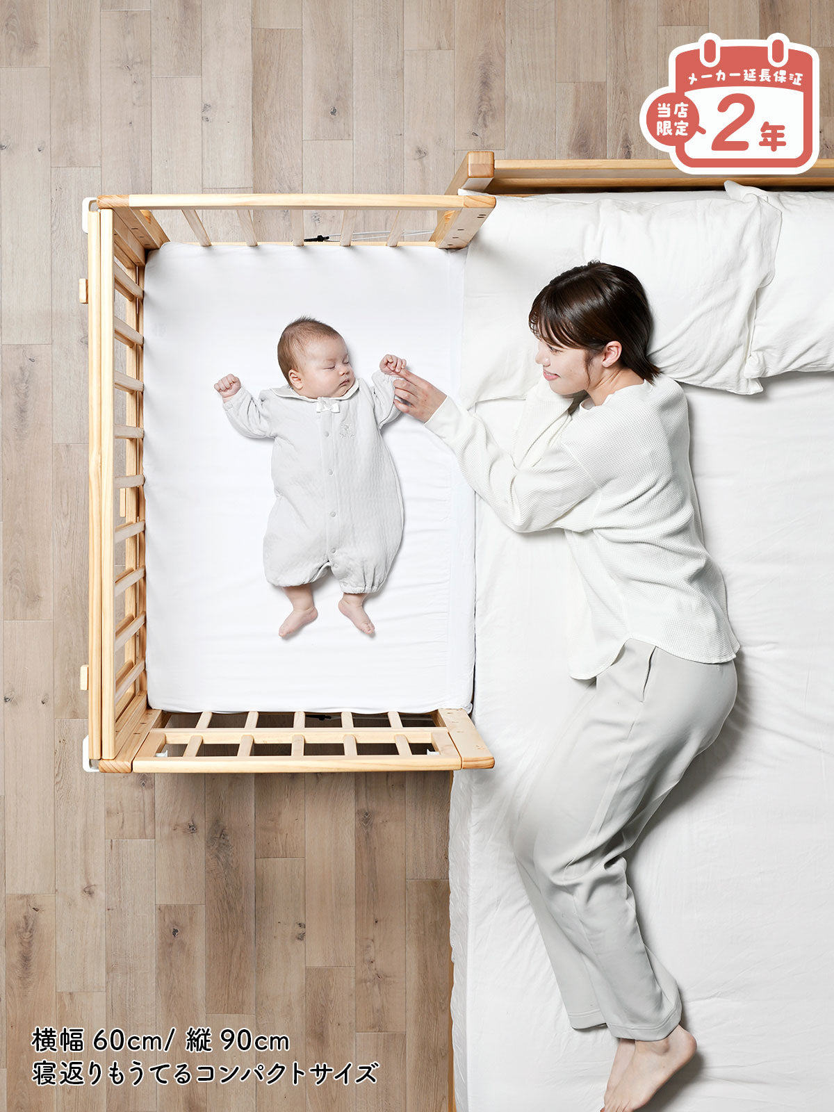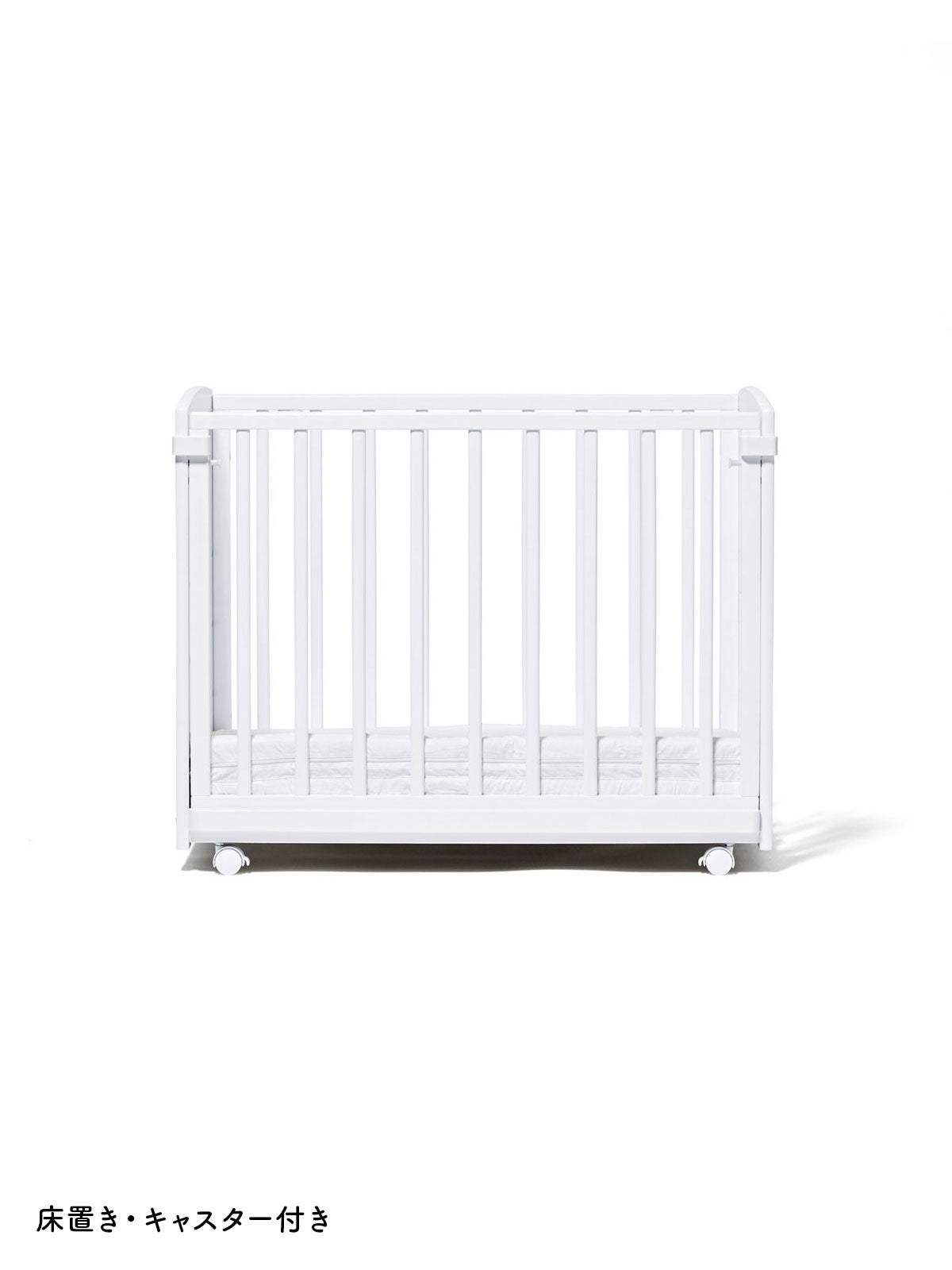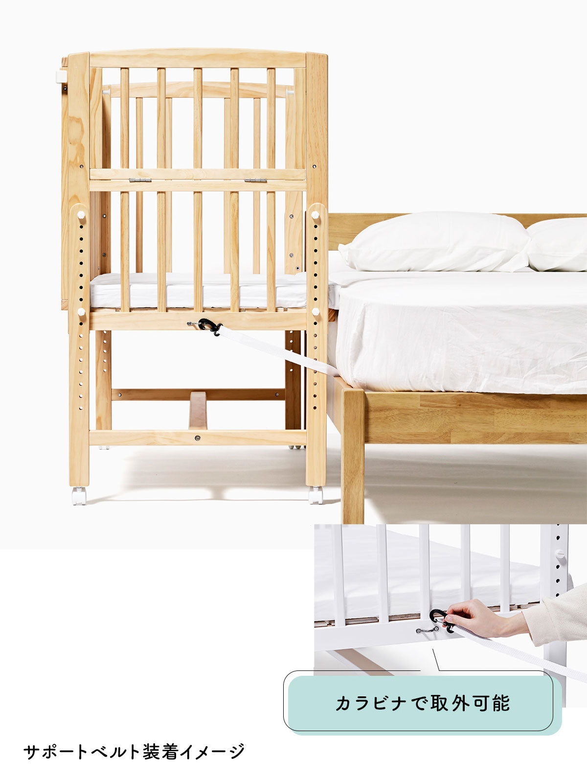 一つのベッドで一緒に寝るよりも気楽で、別々で寝るよりも安心。親子が一緒に寝られるわずかな期間をより素敵な時間にして欲しい。お子様は、ママのにおい、寝息を感じて安心して眠る。ママは、お子様の寝顔を見ながら癒される。そんな添い寝ができるベビーベッド。大人のベッドの高さと合わせ、段差なくつなげて使用可能。キャスター付きでお部屋間の移動もラクラクです。サイドマットレス付シーツ付き。本体はナチュラルとホワイトの2色展開。