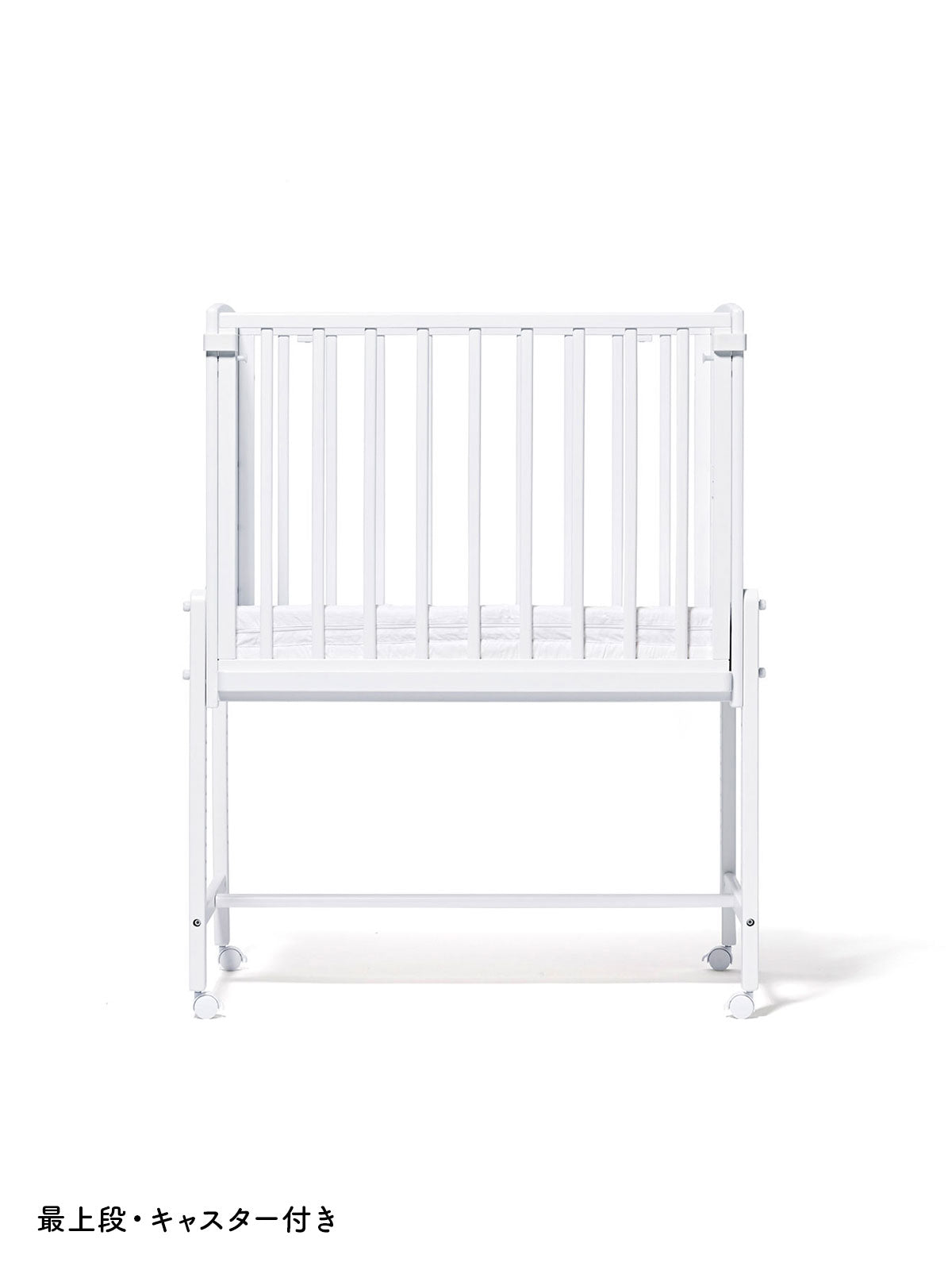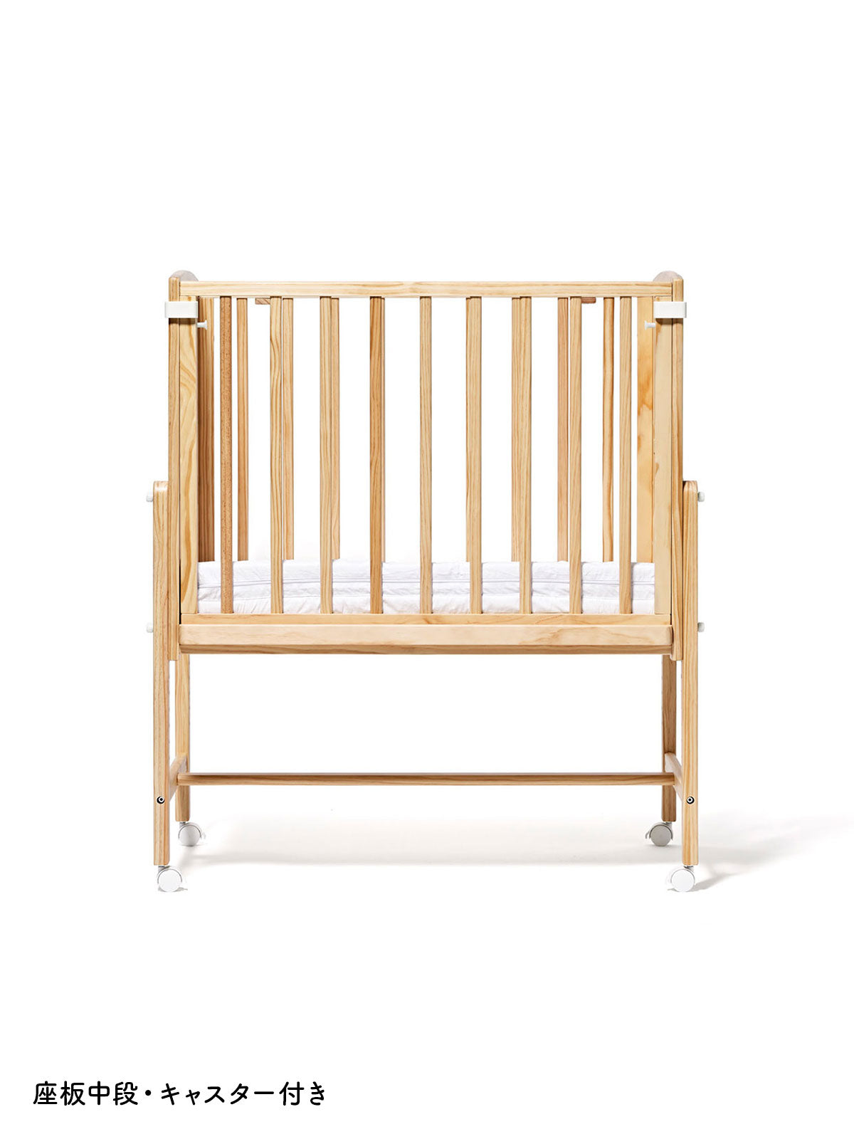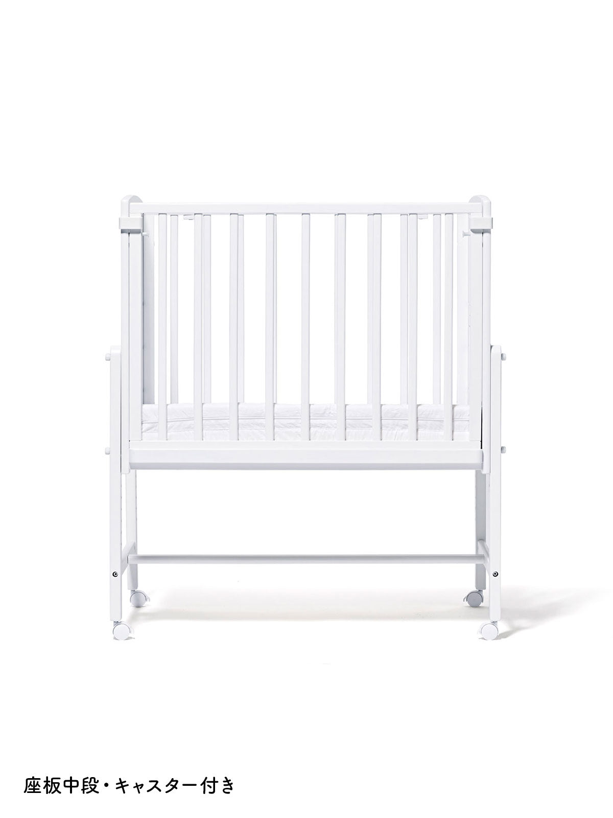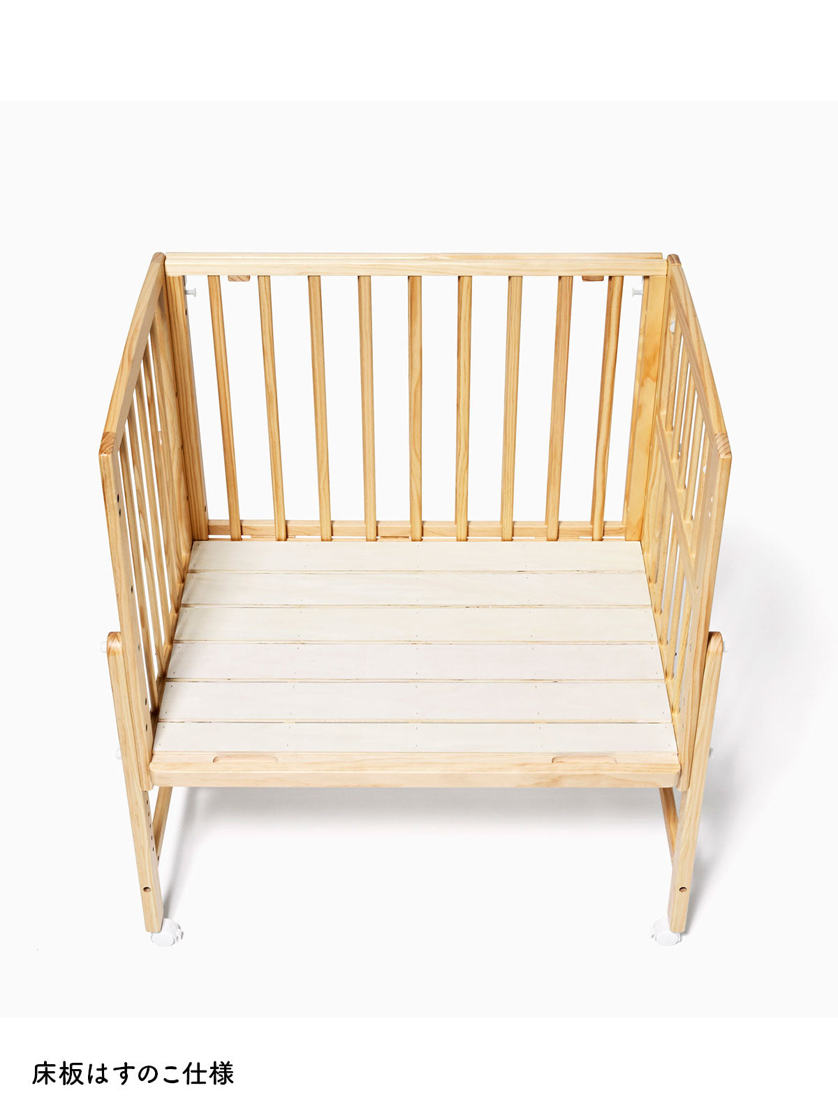 一つのベッドで一緒に寝るよりも気楽で、別々で寝るよりも安心。親子が一緒に寝られるわずかな期間をより素敵な時間にして欲しい。お子様は、ママのにおい、寝息を感じて安心して眠る。ママは、お子様の寝顔を見ながら癒される。そんな添い寝ができるベビーベッド。大人のベッドの高さと合わせ、段差なくつなげて使用可能。キャスター付きでお部屋間の移動もラクラクです。サイドマットレス付シーツ付き。本体はナチュラルとホワイトの2色展開。