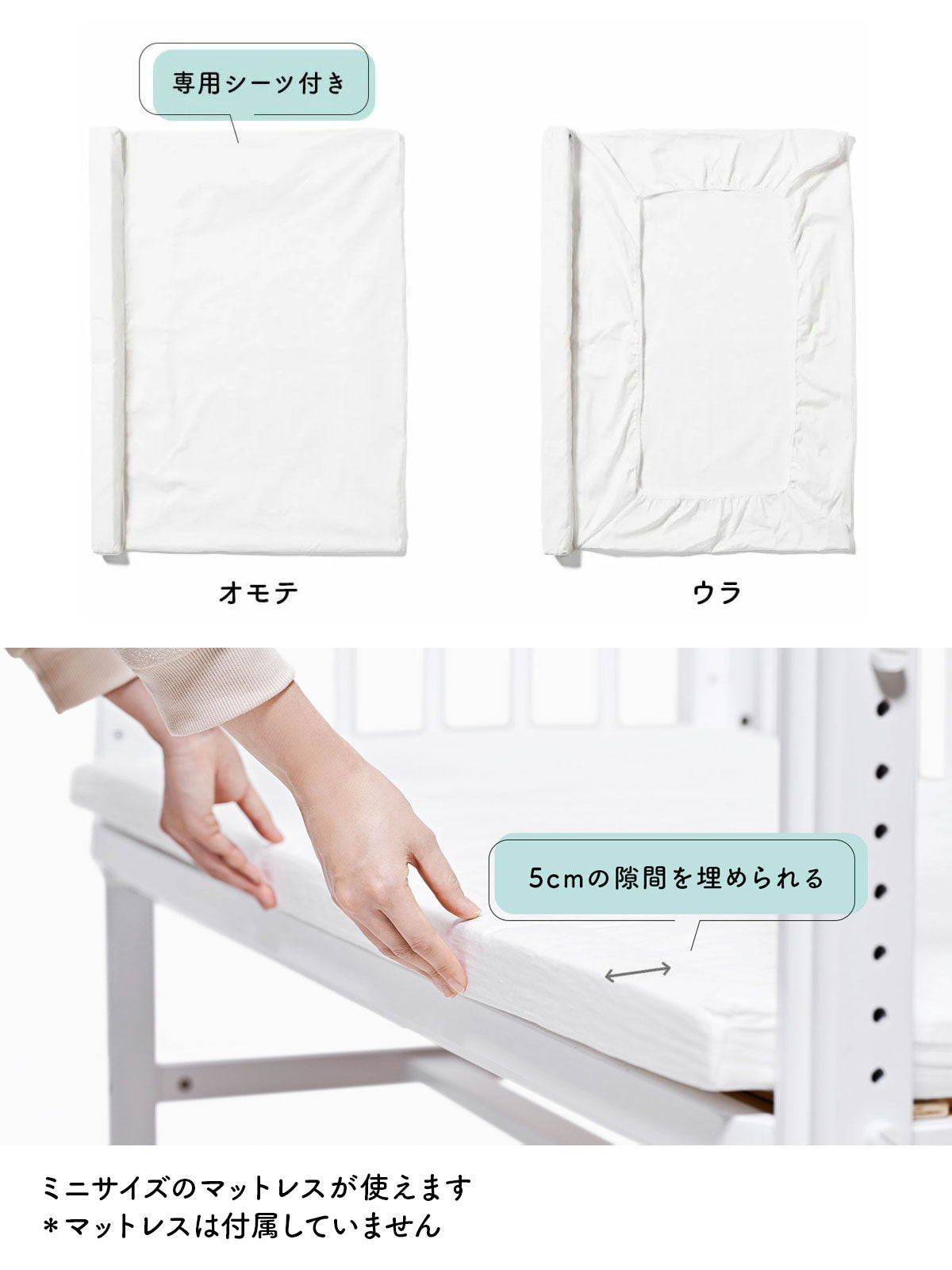 素材 | 本体:天然木(パイン材)・化粧合板 サイドマットレス付きシーツ:生地 綿100% 中綿部分 ポリエステル100%(固綿) |