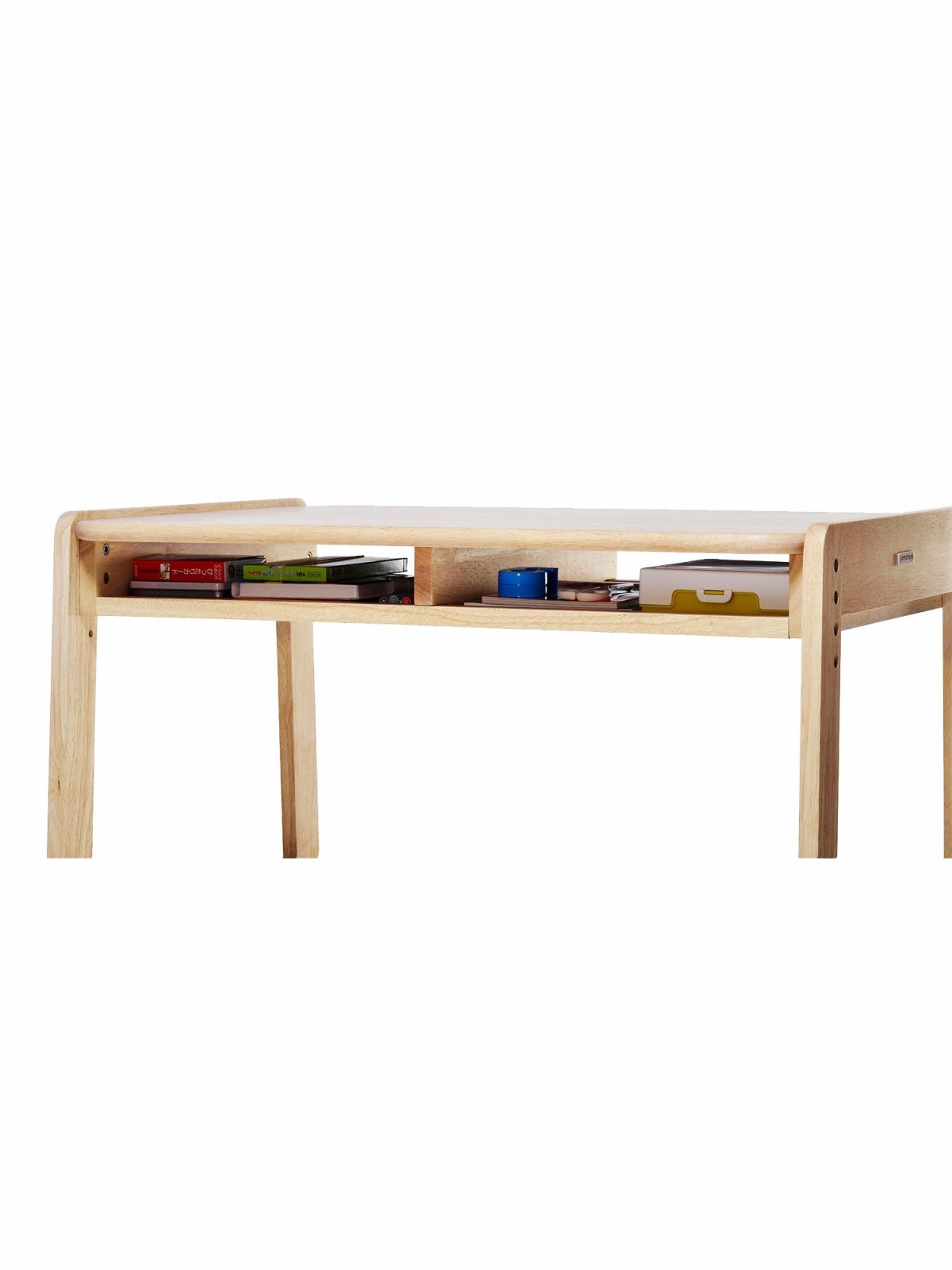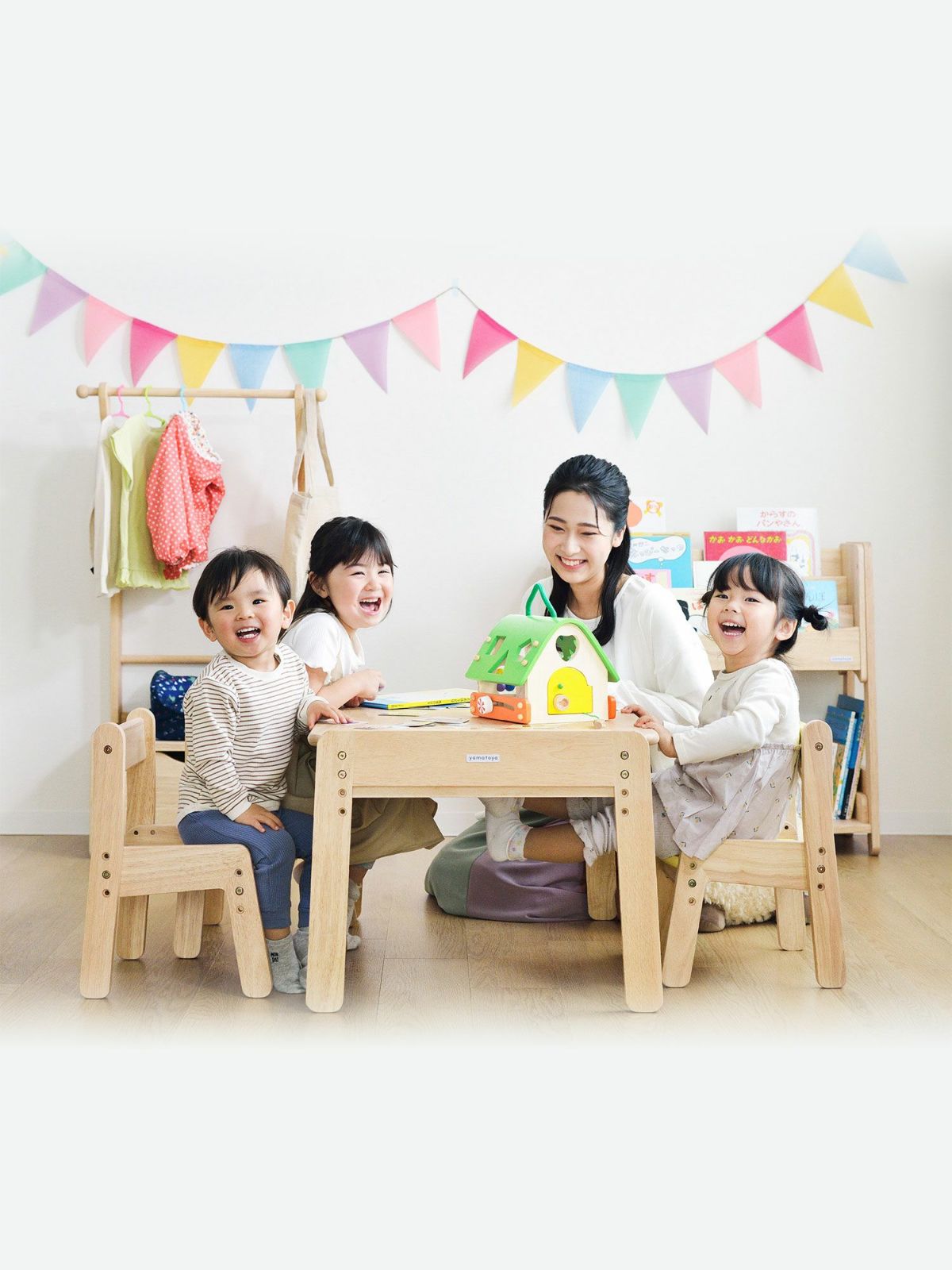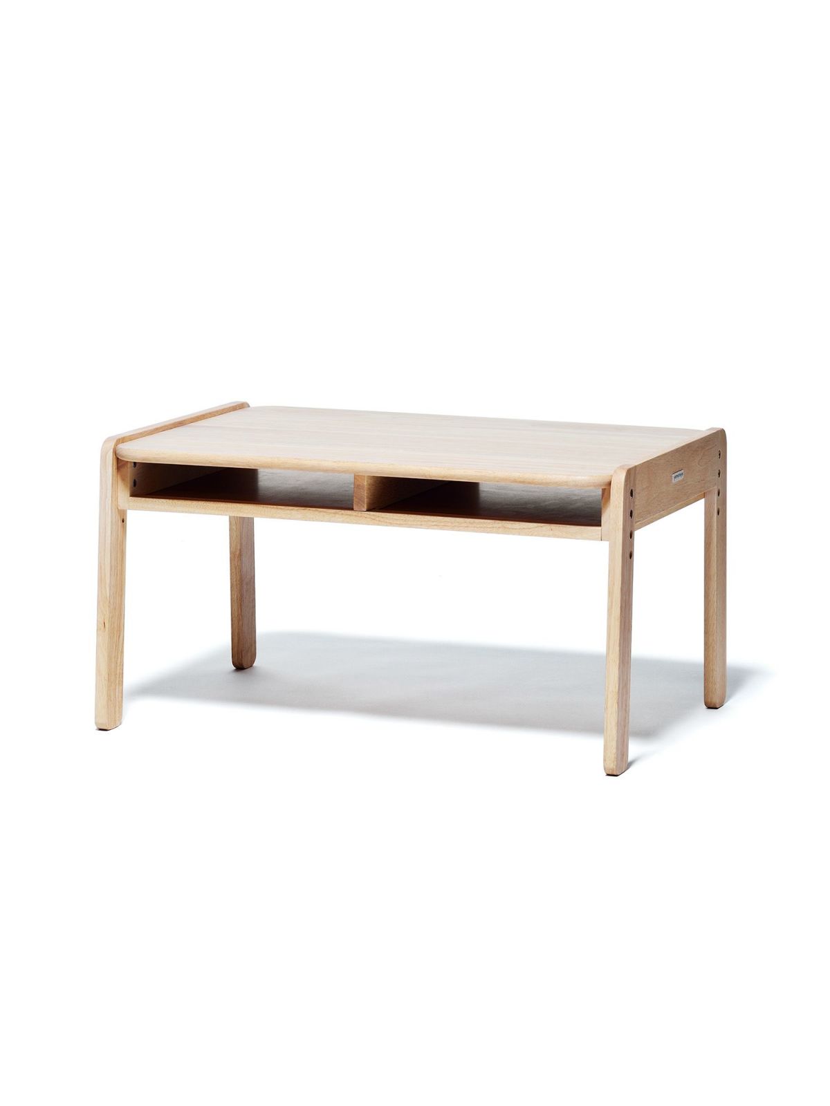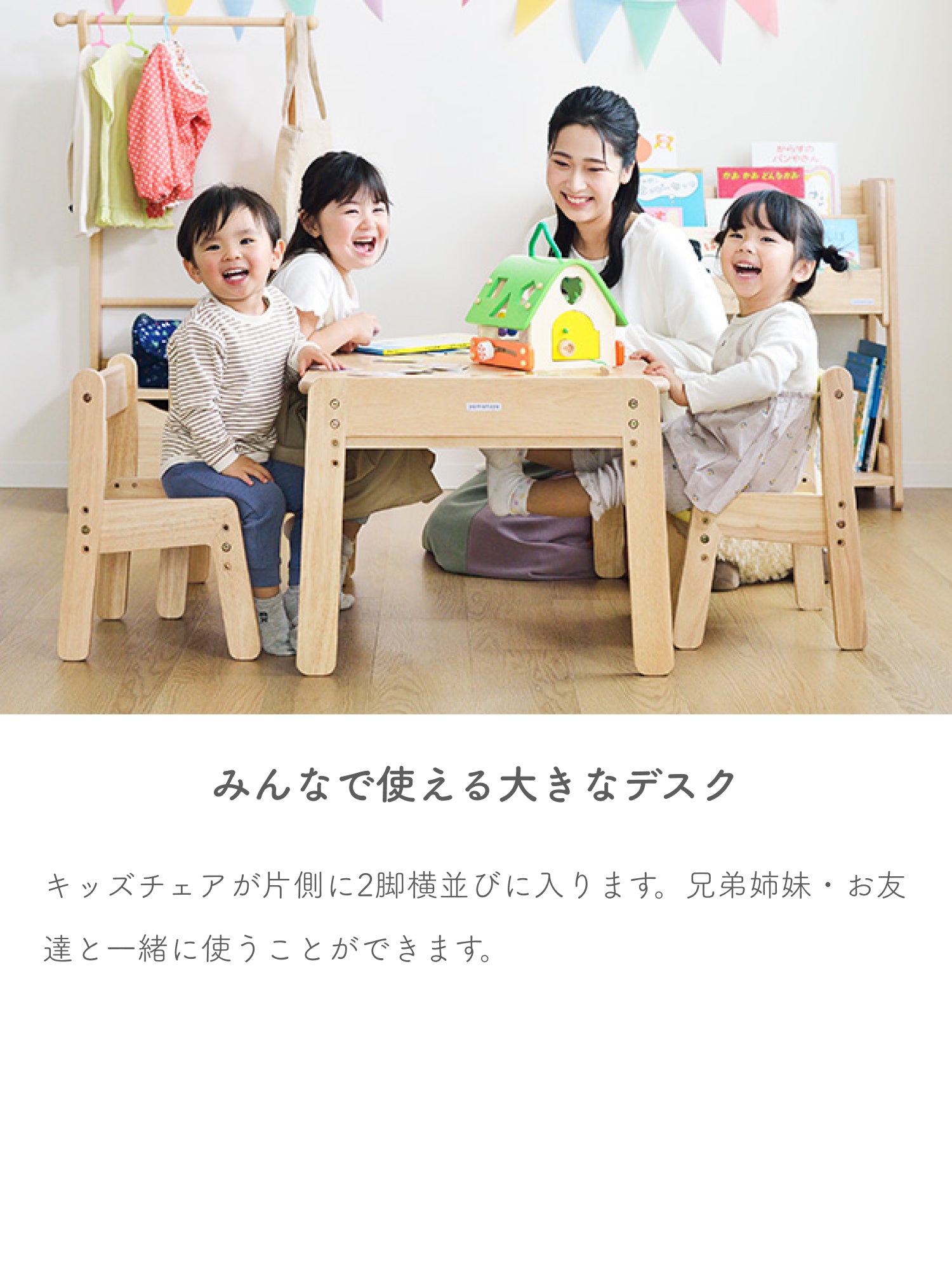 みんなで使える大きなサイズのテーブル。向き合って遊んだり、お絵かきしたり。成長に合わせ高さを3段階に調整できます。キッズチェアを使うと高さもぴったりで、2脚横並びに入ります。テーブルのどちらからでも使用できるオープン棚です。