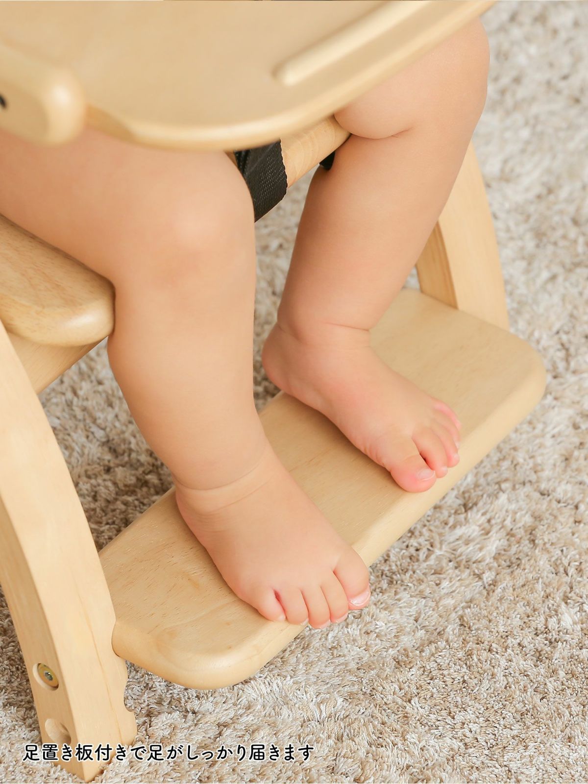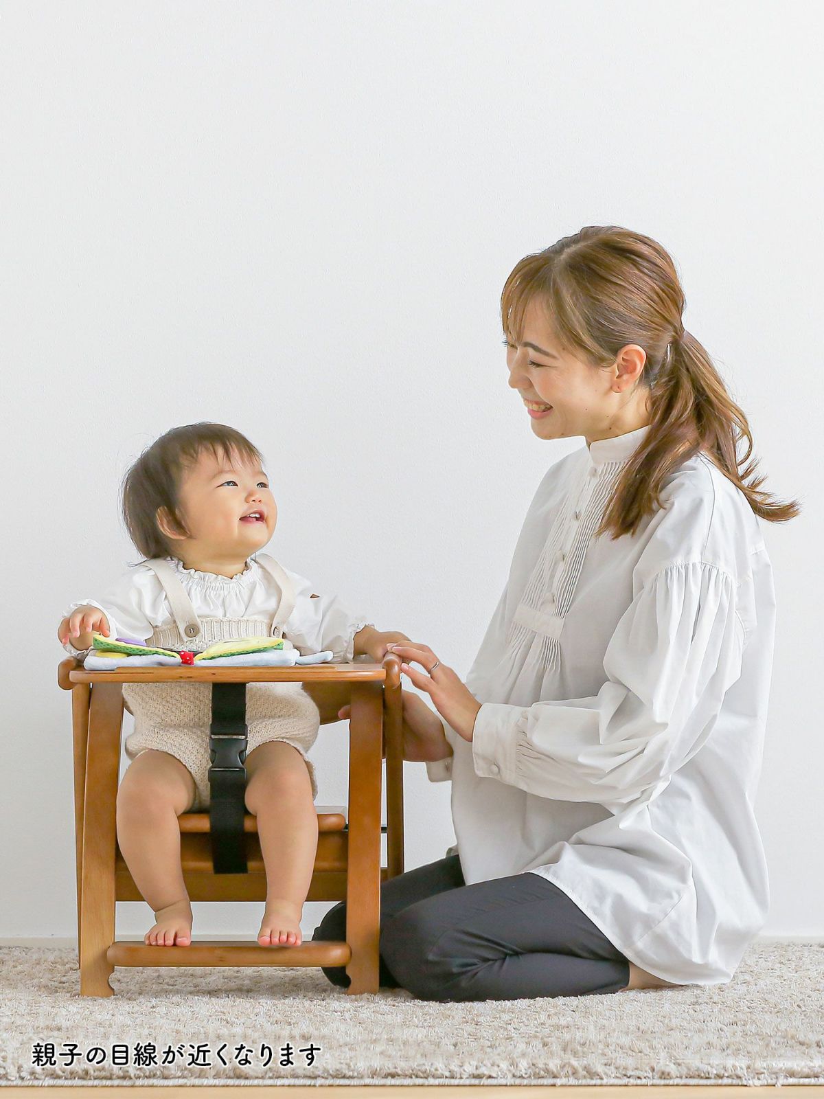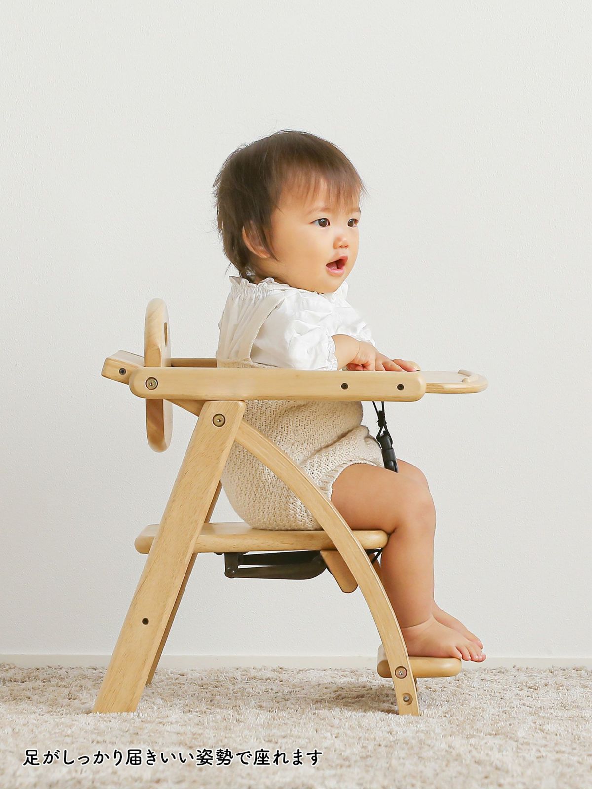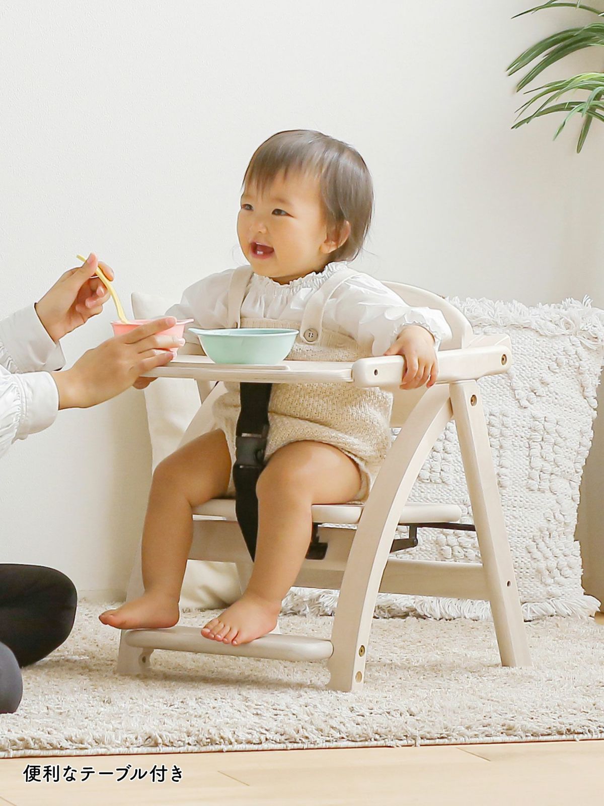 18万人以上のお子さまを支えてきた折りたたみができるローチェアがリニューアル。使いやすい機能はそのままに、姿勢よく座るための足置き板を新たに加え、より安心して座れる設計となりました。成長に合わせて足置き板は2段階の高さ調整が可能。テーブルがあることで食事が取りやすく、遊び場としても活用できます。折りたたみができるので、持ち運びもしやすく、帰省先など車でのお出かけ時にも使うことができます。親子の目線が近くなり、リビングでくつろぐ床暮らしのスタイルにもピッタリ。3才頃までお使いいただけます。